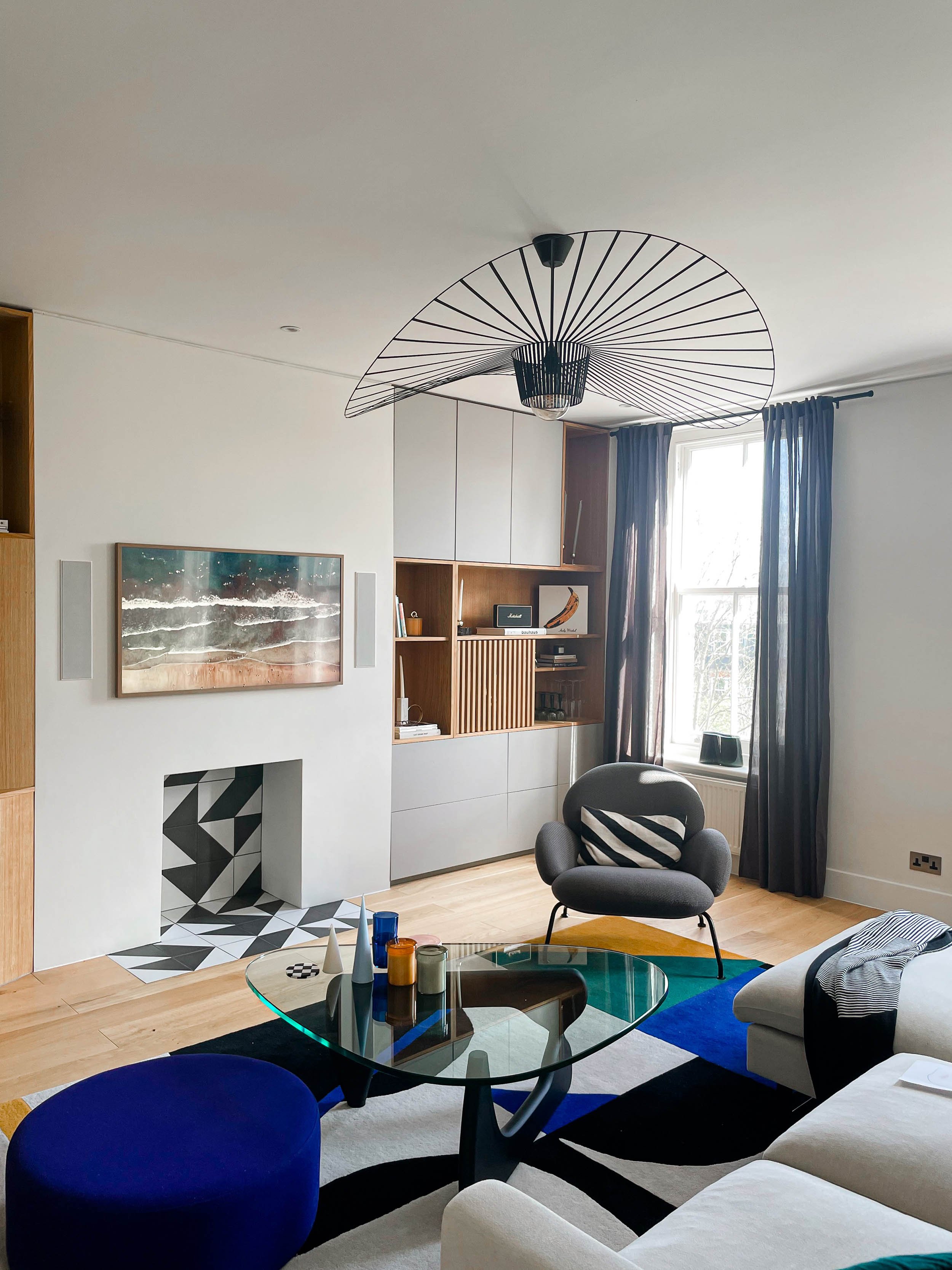 Bespoke joinery was designed to make the best use of the space and allow multiple space usage combining storage and home office. Finally, we carefully sourced and selected the furniture mixing iconic designer items with more affordable pieces to achieve an elegant and graphical design full of originality!